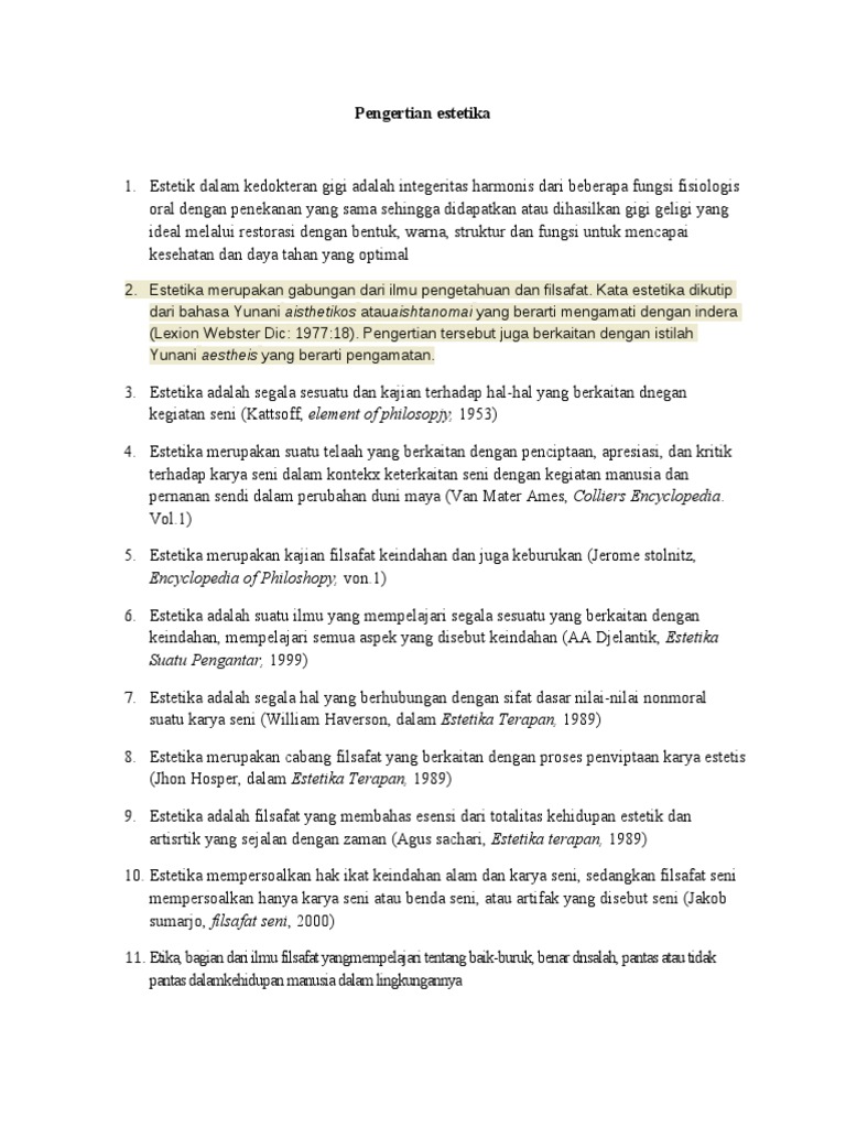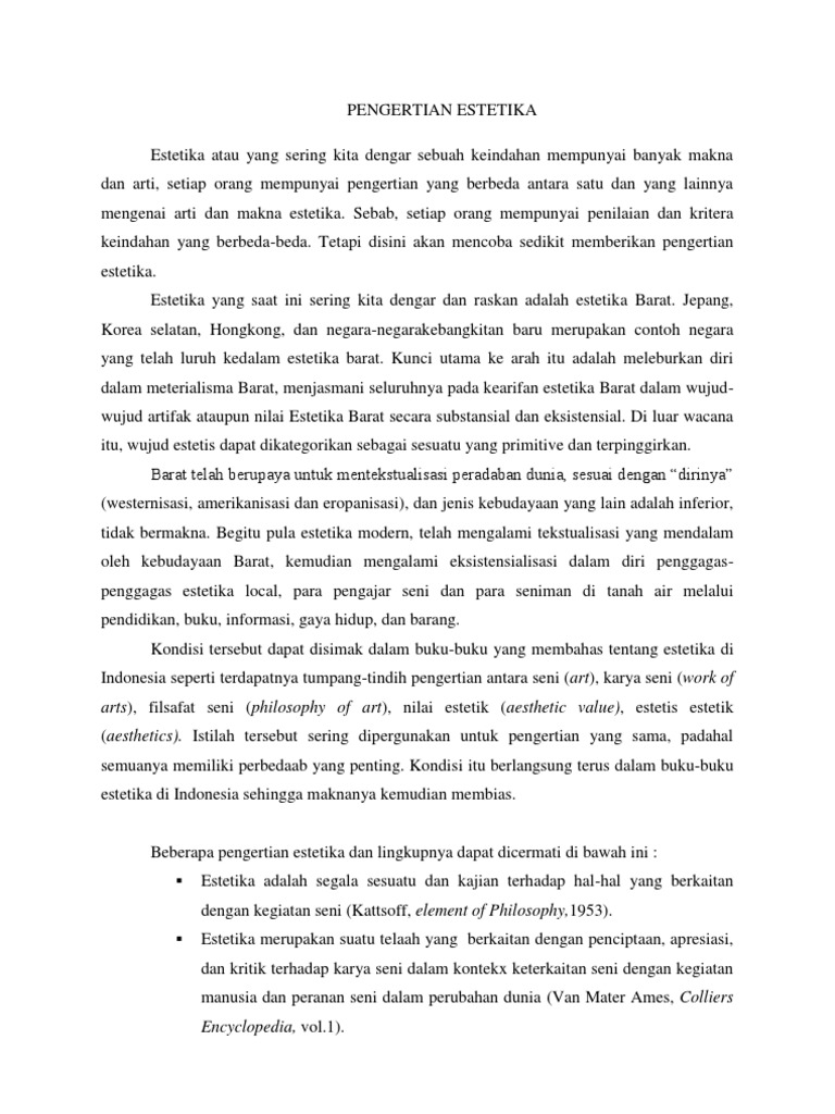 Estetika adalah salah satu cabang filsafat. Pengertian Estetika Menurut Para Ahli. Bila dicermati arti keindahan diatas dapat ditarik kesimpulan bahwa suatu kesatuan arti hubungan-hubungan bentuk yang terdapat di antara pencerapan-pencerapan inderawi manusia.